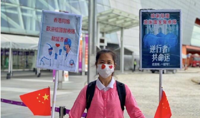 在香港街头,有市民手舉標語牌,并揮舞着國旗,感謝并歡迎內地醫護人員的支援。