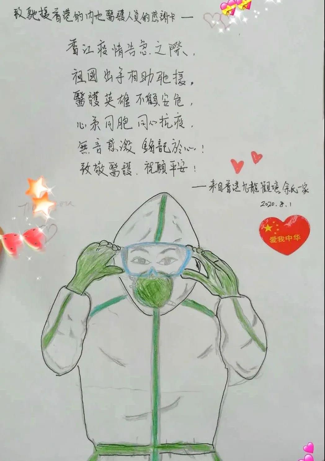 还有一位香港小朋友与家人特地亲手制作了一张感谢卡,上面写着「香江疫情告急之际,祖国出手相助驰援,医护英雄不顾安危,心系同胞同心抗疫,无言感激,铭记于心!致敬医护,祝愿平安!」