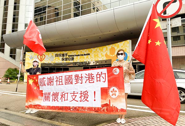 昨午3時許,位於亞博館的港版「方艙醫院」外,有市民揮舞着巨幅五星紅旗和香港特別行政區區旗,舉起寫有「感謝祖國,感謝國家醫療隊」、「國家醫療隊助港抗疫」等標語牌,歡迎前來香港的先遣隊隊員;還有市民揮舞國旗,齊聲高喊:「多謝祖國,多謝祖國的醫療團隊,歡迎來香港。」