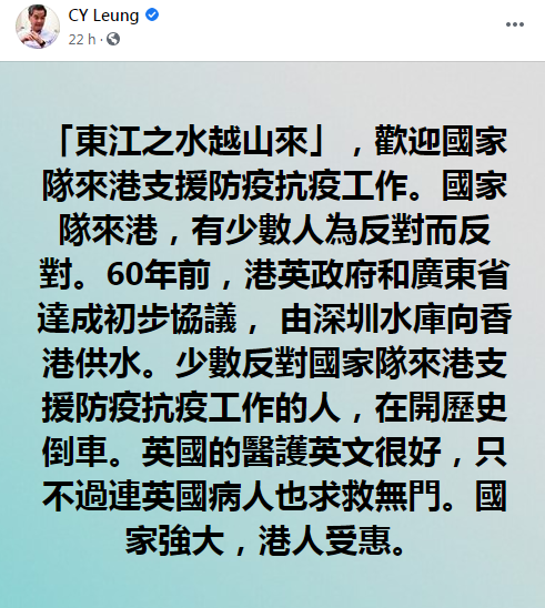 梁振英表示,國家隊來港,有少數人為反對而反對,英國的醫護英文很好,只不過連英國病人求救無門。梁振英引用60年前港英政府和廣東省達成初步協議,由深圳水庫向香港供水的事例,指出少數反對國家隊來港支援防疫抗疫工作的人,在開歷史倒車。
