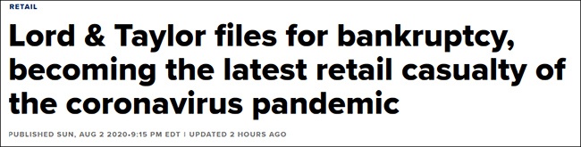 【香港商报网讯】据美国消费者新闻与商业频道(CNBC)当地时间8月2日报道报道,号称美国历史最悠久的奢侈品百货罗德与泰勒公司(Lord & Taylor)2日申请破产保护,是最新一家受新冠疫情冲击而破产的零售业公司。