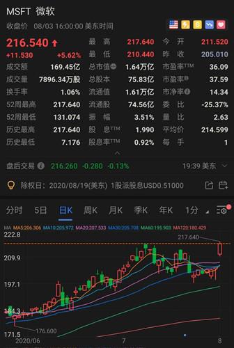 美东时间8月3日收盘,微软股价为216.54美元,涨5.62%,单日市值增长872亿美元,总市值1.64万亿美元,位居全球第二,仅次於苹果。