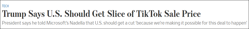 特朗普3日又撂狠话,称在9月15日前TikTok必须要卖给美国公司,否则将关门大吉。更加过分的是,特朗普还提出,TikTok的这笔交易应上交相当大一笔「佣金」给美国国库!