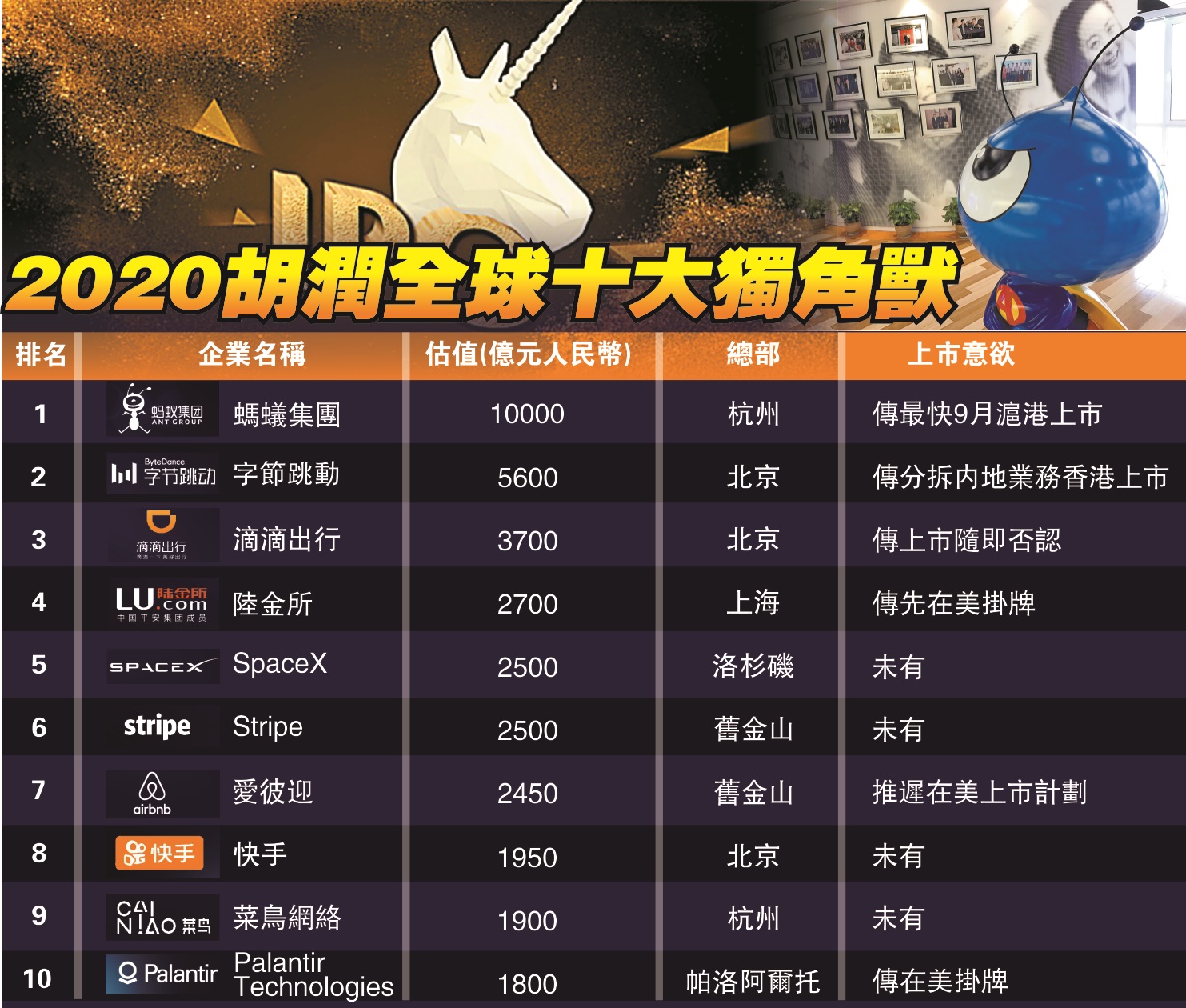 獨角獸企業對所有交易所來說都是必爭的「香餑餑」。除了螞蟻集團之外,不少中資獨角獸亦值得香港市場期待。昨日發布的《2020胡潤全球獨角獸榜》顯示,十大之中有6個來自中國,包括螞蟻集團、字節跳動、滴滴出行、陸金所、快手和菜鳥網絡。蟬聯第一的螞蟻集團估值為1萬億元人民幣,抖音及TikTok的母企字節跳動以5600億元人民幣估值蟬聯全球第二大獨角獸,今年估值上升600億元。