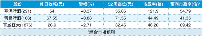 面對中美摩擦加劇,加上全球新冠肺炎疫情反覆,各國對外貿易困難重重,唯有力谷本土消費,因此內需消費股近日表現突出,其中啤酒股最為強勁。潤啤、百威亞太及青島啤酒(168)上周五股價紛紛造好,惟近日出現回吐,昨日僅潤啤升0.37%,青啤及百威分別跌0.88%及2.71%。