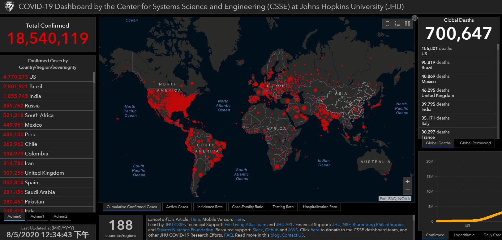 据美国约翰斯·霍普金斯大学的最新统计数据,截至香港时间8月5日12时34分,全球新冠确诊病例累计超1854万例,累计死亡超70万例,达700647例。