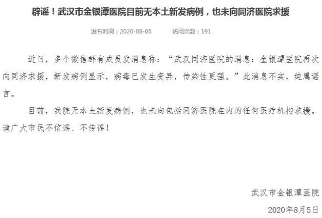 【香港商报网讯】据中新网消息:武汉市金银潭医院5日在官网发布闢谣声明称,近日,多个微信群有成员发消息称:「武汉同济医院的消息:金银潭医院再次向同济求援,新发病例显示,病毒已发生变异,传染性更强。」此消息不实,纯属谣言。