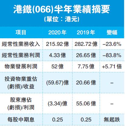 【香港商報网訊】記者周健鑫報道:港鐵(066)昨日公布中期業績,受新冠肺炎疫情打擊,期內總乘客量6.373億人次,較去年同期下跌37.7%,罕見地錄得中期虧損,期內收入215.92億元,按年減23.6%,股東應佔虧損3.34億元,相對去年同期盈利為55億元,每股基本虧損0.05元,派中期息25仙。集團行政總裁金澤培坦言,未肯定會否再向市民提供票務優惠。