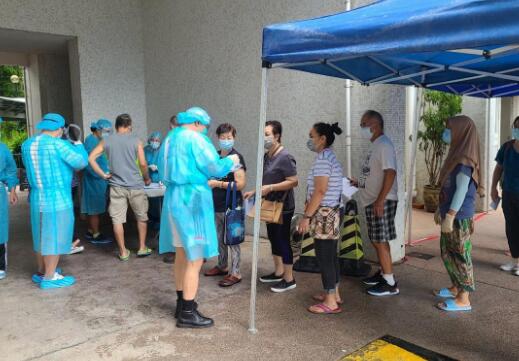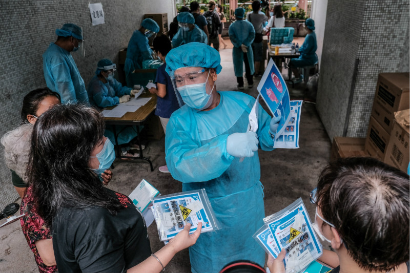 今早有身穿保護衣的工作人員向居民派發咽拭子採樣套裝和口罩。