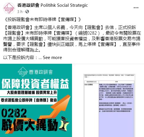 香港政研會主席鄧德成以個人名義去信香港證監會,正式投訴該會未有即時將壹傳媒停牌,最終令有關股票在市場上股價大幅異動,可能損害投資者權益,及影響香港股票交易市場聲譽,要求該會盡快糾正錯誤,馬上將壹傳媒停牌,直至事件得到合理解釋為止。