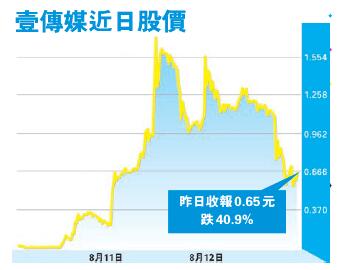 壹傳媒股價經歷「非理性暴升」後,昨日再上演暴升暴跌。早市最多曾升59%,高見1.75元;午後獲利盤湧現,股價尾市最多倒插53%,收市報0.65元,跌40.9%。市場人士認為,壹傳媒股價脫離基本因素,不建議投資者買入。