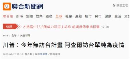 不過,台灣“中央社”12日刊發來自華盛頓的專電稱,美國總統特朗普接受美國保守派電台節目主持人修伊特采訪,除了談到即將來臨的總統大選與美國疫情、內政等議題外,修伊特也問及阿紮前往台灣訪問是否有更大意涵,以及特朗普是否考慮在年底前前往台灣進行“歷史性訪問”。