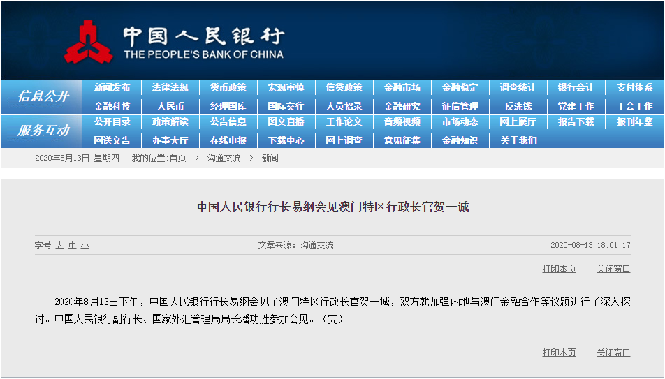 2020年8月13日下午,中國人民銀行行長易綱會見了澳門特區行政長官賀一誠,雙方就加強內地與澳門金融合作等議題進行了深入探討。中國人民銀行副行長、國家外匯管理局局長潘功勝參加會見。