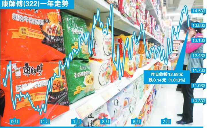 溫傑表示,康師傅市佔率為內地之冠,股價仍有上漲空間,但同樣因早前累積龐大升幅,認為可待股價回調至14元吸納,上望16元,止蝕12.6元。