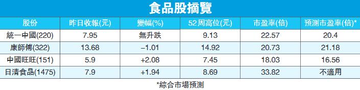光大新鴻基財富管理策略師溫傑接受本報訪問指出,新冠肺炎疫情仍未消除,全國超市繼續開放營業,有利即食麵及飲品的需求,食品股可謂較具防守性,料股價可平穩發展。他認為,上半年為即食麵銷售的「黃金期」,隨着內地企業逐步「復工復產」,料下半年銷量增幅將會放緩,未來銷售將依靠單價上升帶動。