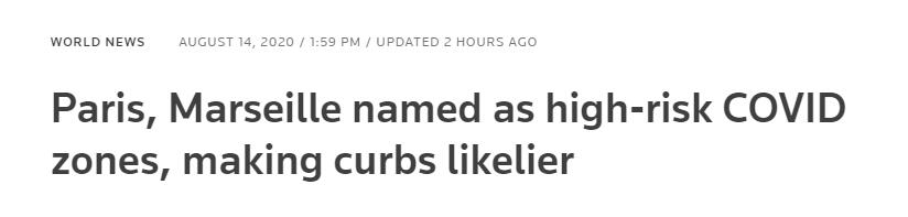 据路透社报道,法国政府14日发布政令,宣布巴黎市和马赛市以及周边地区再次划为新冠病毒高风险地区,感染几率极高。