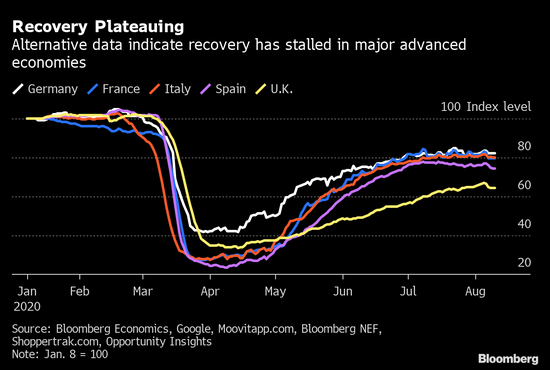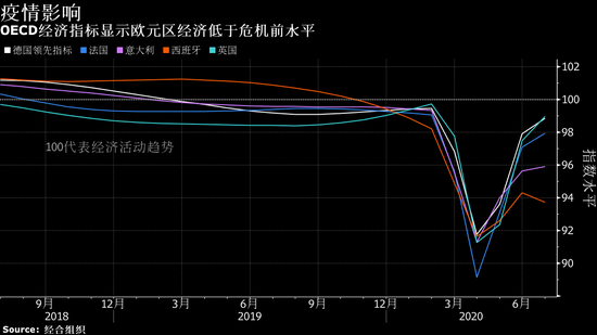 「抗疫封锁措施解除后产出激增,但欧洲经济复苏现在似乎在离正常水平还差5%到10%之时便停滞不前。社交疏离要求、消费者谨慎心理、外部需求,统统降低了经济的上限。不幸的是,即便经济活动如此低迷,也可能无法远离新冠病毒。」