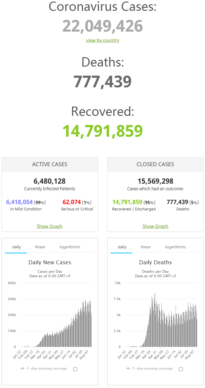 Worldometers世界實時統計數據顯示,截至北京時間8月18日11時08分,全球新冠肺炎累計確診病例突破2204萬例,達到22,049,426例,累計死亡病例超過77.7萬例,達到777,439例。美國新冠肺炎累計確診病例全球最多,突破561萬例,達到5,612,027例,累計死亡病例超過17.3萬例,達到173,716例。