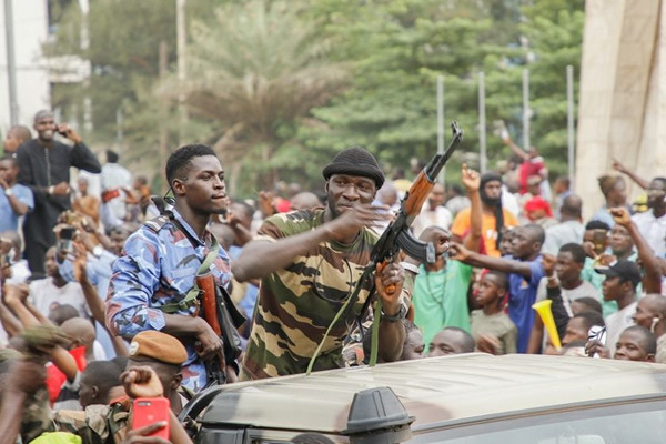 當地時間8月18日,士兵們在巴馬科開車沿着獨立大道遊行,人群歡呼。