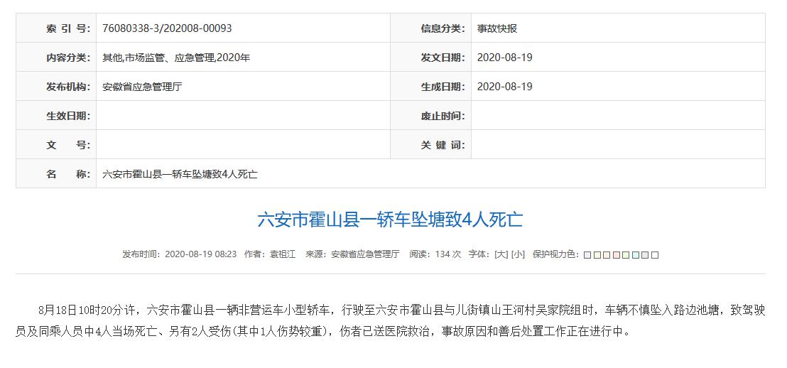 据安徽省应急管理厅网站消息,8月18日10时20分许,六安市霍山县一辆非营运车小型轿车,行驶至六安市霍山县与儿街镇山王河村吴家院组时,车辆不慎坠入路边池塘,致驾驶员及同乘人员中4人当场死亡、另有2人受伤(其中1人伤势较重),伤者已送医院救治,事故原因和善後处置工作正在进行中。