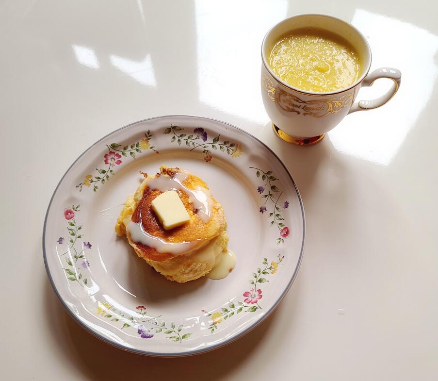 香港罕見地掛了9號風球,難得可以心安理得慢悠悠地做個早餐,鮮打玉米汁加日式梳乎厘。
