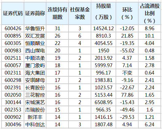 社保基金持有期限最长的个股是华鲁恒升,自2012年四季度以来已累计持有31个季度。社保基金持有期限较长的还有双汇发展、恒顺醋业、西山煤电等,已连续持有26、22、20个季度。从二季度末社保基金持股量来看,华鲁恒升、双汇发展、中国巨石等持股数量居前。社保基金持股比例居前的有双汇发展、华鲁恒升等。