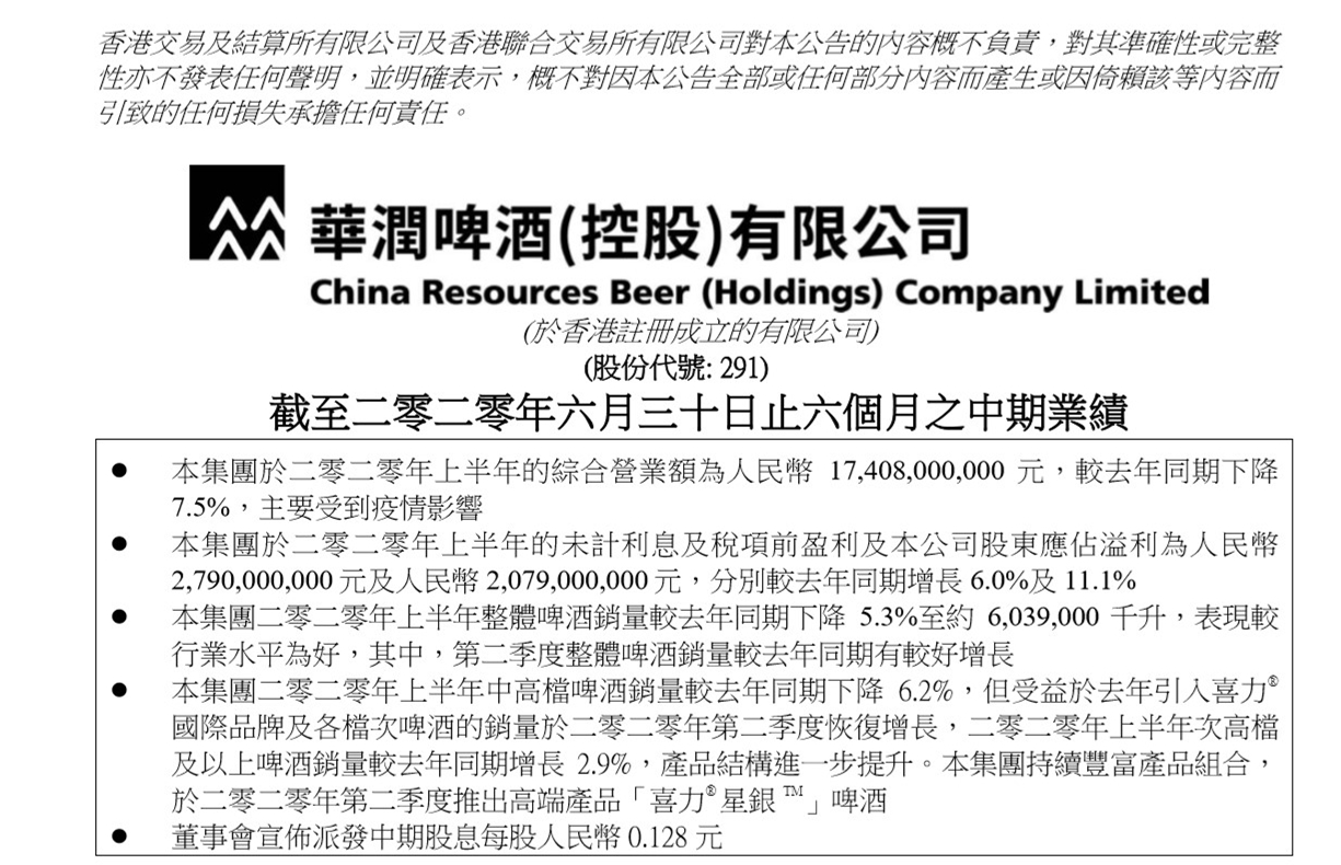8月19日,華潤啤酒(控股)有限公司(港交所股份代號:00291)宣佈了其截至2020年6月30日止未經審核的中期業績。根據披露的信息顯示:2020年上半年,華潤啤酒綜合營業額為人民幣17,408,000,000元,受疫情影響,較去年同期下降7.5%。2020年上半年的未計利息及稅項前盈利及本公司股東應占溢利為人民幣2,790,000,000元及人民幣2,079,000,000元,分別較去年同期增長6.0%及11.1%。董事會宣佈派發中期股息每股人民幣0.128元(2019年中期︰每股人民幣0.12元)。