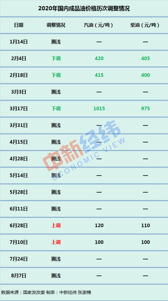 中新经纬客户端注意到,今年以来,国内成品油价格已经历15次调整,其中10次搁浅、3次下调、2次上调,汽、柴油价格分别累计下调1630元/吨、1570元/吨。3月31日至6月11日的6轮调整均因国际市场原油价格低於40美元/桶而搁浅。