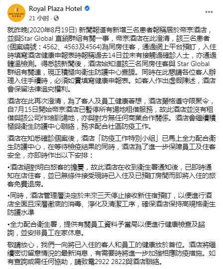 帝京酒店昨日在社交媒體表示,從報道中得悉與直銷群組有關的3名確診患者曾居於帝京酒店,相關人士為同房住客,通過網上平台預訂,入住時填寫健康申報表時報稱過去14日未有接觸確診者,亦通過體溫檢測。酒店重申客人如作出虛假陳述,酒店會保留法律追究權利。