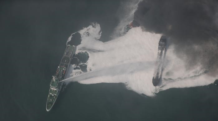 21日5时15分,在现场指挥船“海巡01”的统一指挥下,“海巡01”“东海救101”“东海救102”开始对船体实施持续喷水降温,并由“东海救102”“中化应急”“沪消5”等3艘船舶集中对事发油船实施泡沫饱和攻击灭火。
