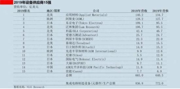据2019年半导体设备供应商排名,位居前五的供应商占全球58%的行业营收,其中3家是美国企业,另外2家(日本东京电子、荷兰阿斯麦)则被美国扶持多年。