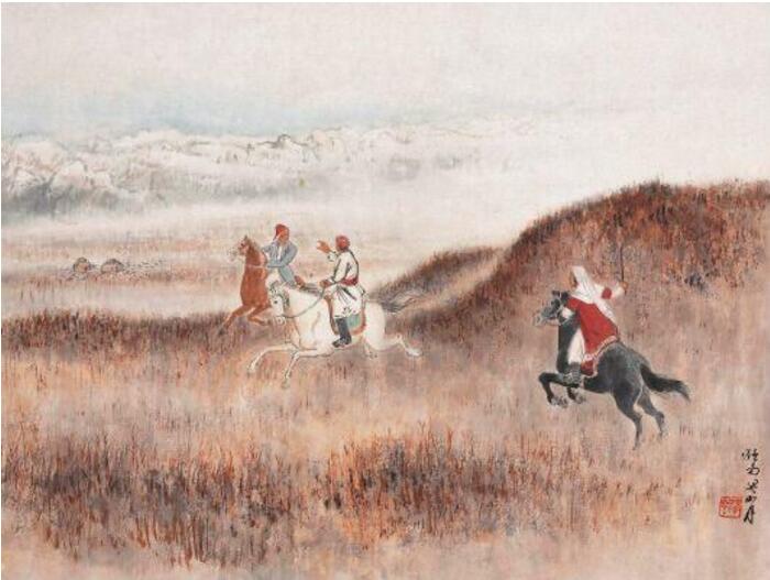 1945年1月13日,关山月在重庆举办“西北纪游画展”,展出西北写生以及临摹敦煌壁画作品100多幅。郭沫若为《塞外驼铃》和《蒙民牧居》两幅作品题诗作跋。是年八月,关山月在成都举办“西南、西北写生和敦煌壁画临摹作品展”。于右任为《鞭马图》题词:“冰雪生活,英雄气度,勒马沙场,祖国永护。”在重庆和成都举办的纪游画展是关山月西行写生的阶段性总结,而后于1948年8月8日出版的《关山月纪游画集第一辑•西南西北旅行写生选》正是最好的记录。