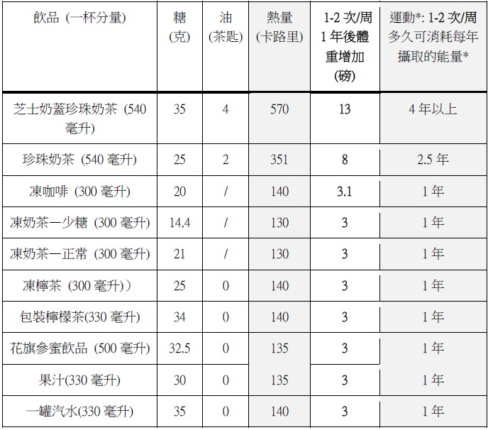 看以下列表,下次訂飲品時,能夠大概估計卡路里和糖的含量,小小一杯可能會隱藏不少糖分炸彈: