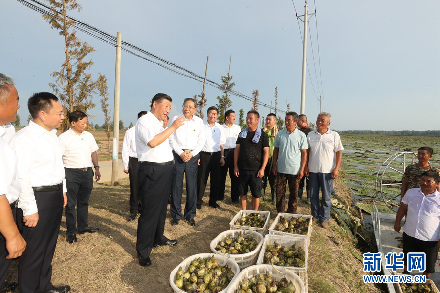 18日下午,习近平在阜阳市阜南县蒙洼蓄洪区,同正在采摘芡实的乡亲们亲切交流,了解灾后生产恢复情况。 新华社