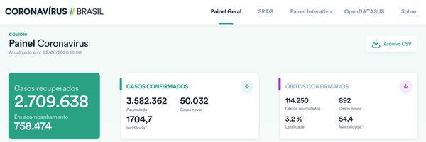 根据巴西卫生部22日公布的数据,截至当地时间18时,该国单日新增新冠肺炎确诊病例50032例,累计确诊3582362例,新增死亡病例892例,累计死亡114250人,共有2709638名患者康复。