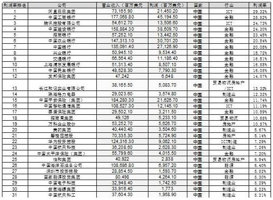 其中阿里利润率29.32%排第一位,工商银行利润率25.52%排第二位,腾讯利润率24.73%排第三位。