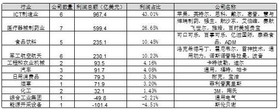ICT制造业有5家(英特尔,思科,苹果,惠普,戴尔),医疗器械和制药业有7家(强生,雅培,辉瑞制药,艾伯维,默沙东,赛默飞世尔,百时美施贵宝),军工航空航天类企业有5家(霍尼韦尔,洛克希德马丁,通用动力,雷神技术,诺斯洛普格拉曼),日用消费品2家(耐克,宝洁),食品饮料3家(可口可乐,亿滋国际,百事),其他还有烟草1家(菲利普-莫里斯),工业和日用化工1家(3M电气),工程机械1家(卡特彼勒),农业机械1家(迪尔),汽车制造(帕卡公司,做卡车的)。