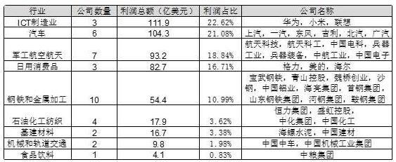 中美的相同点是,中国入选制造业公司来自ICT制造业的利润总额也是最高的,三家公司(华为,小米,联想)达到111.9亿美元,占比为22.62%。
