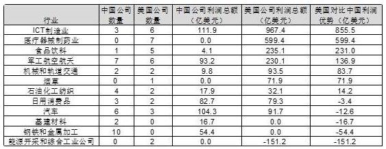 把两国的五百强企业行业做利润对比,则得出以下结论: