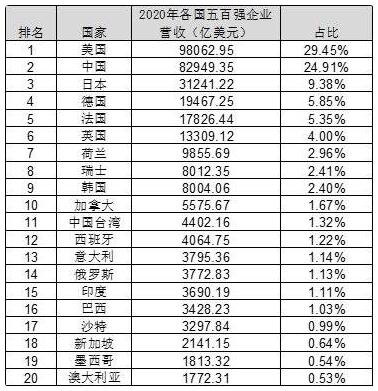 中国第二为8.2949万亿美元,占全球500强企业总和的24.91%,