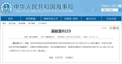 冀航警0223,渤海,自2020年8月24日0000时至9月30日2400时在以39-24-35N 119-13-44E为基点,半径25公里,正东方向至正南偏西6°、夹角96°的扇形区域内,执行实弹射击活动,该扇形区域的2个顶点坐标分别为39-24-14N 119-28-24E和39-13-13N 119-11-51E,禁止驶入。