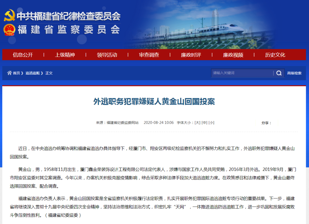 福建省追逃办负责人表示,黄金山回国投案是全省监察机关积极履行法定职责,扎实开展职务犯罪国际追逃追赃专项行动的重要战果。下一步,福建省将继续深入贯彻十九届中央纪委四次全会精神,坚持法治思维和法治方式,织密扎牢「天网」,一体推进追逃防逃追赃工作,进一步巩固和发展反腐败斗争压倒性胜利。