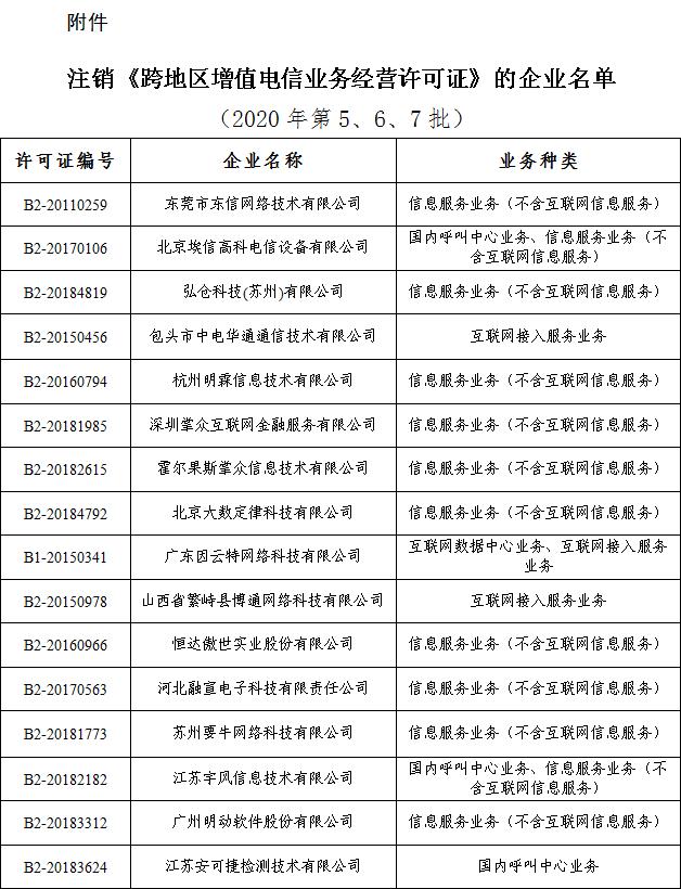 附件:注销跨地区增值电信业务经营许可的企业名单(2020年第5、6、7批).docx