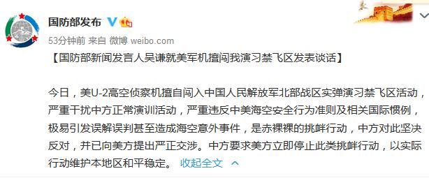 据国防部发布官微,今日(8月25日),美U-2高空侦察机擅自闯入中国人民解放军北部战区实弹演习禁飞区活动,严重干扰中方正常演训活动,严重违反中美海空安全行为准则及相关国际惯例,极易引发误解误判甚至造成海空意外事件,是赤裸裸的挑衅行动,中方对此坚决反对,并已向美方提出严正交涉。中方要求美方立即停止此类挑衅行动,以实际行动维护本地区和平稳定。