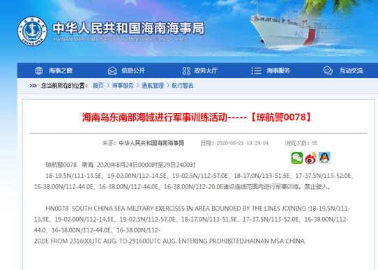 海南海事局8月21日发布的航行警告