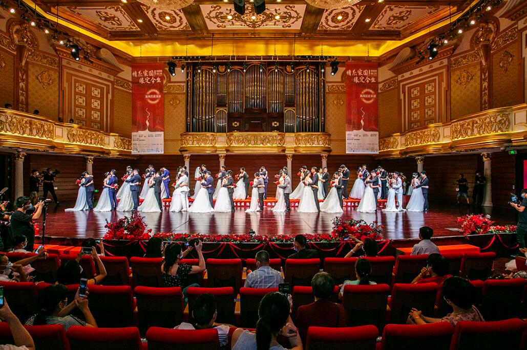 下午5點半,28對抗疫新人在親朋好友的見證和祝福下,在星光熠熠的華發中演大劇院莫扎特音樂廳喜結良緣,以愛之名,百年好合。