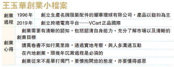 在鈕扣公司之外,王玉華一直尋找新突破點。2015年前後,她留意到內地經濟模式發生轉變,內地市場對於進口商品有很大需求,香港作為自由貿易港,在獲取來自全球產品有得天獨厚的優勢。倘若兩者能夠結合,是否會孕育更大的商機?