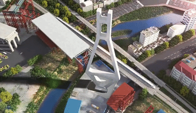 今年4月10日,龙岩大桥的主塔曾进行过一次69度的转体施工。龙岩大桥连续跨越赣龙铁路、龙厦铁路,每天有近120班列车经过。为降低桥梁施工对铁路交通的影响,大桥需采取转体施工法进行建设。同时,由于龙岩大桥主塔采用了扁平的“宝石”型设计,主塔侧面距铁路的最近距离不足6.5米,为保障施工安全,需要在“塔梁共转”的常规转体施工前,对桥梁主塔首先进行一次“独塔单转”。即将主塔在距铁路20米左右的距离进行施工,建设完成后,首先进行单独的主塔转体,主塔到位后再进行桥面梁体架设施工,待桥面梁体全部安装完成后,主塔和桥面再整体进行第二次转体。一座桥梁在建设过程中进行两次转体的施工方法,在世界桥梁转体施工领域十分少见。