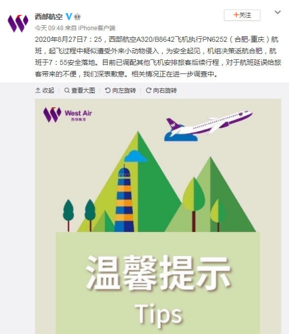 据西部航空 官方微博号消息,2020年8月27日7:25,西部航空A320/B8642飞机执行PN6252(合肥-重庆)航班,起飞过程中疑似遭受外来小动物侵入,为安全起见,机组决策返航合肥,航班于7:55安全落地。目前已调配其他飞机安排旅客后续行程,相关情况正在进一步调查中。一位乘客表示,听到航班广播说机械故障时,心里很紧张,但返航的整个过程没有任何颠簸,最后平安降落。