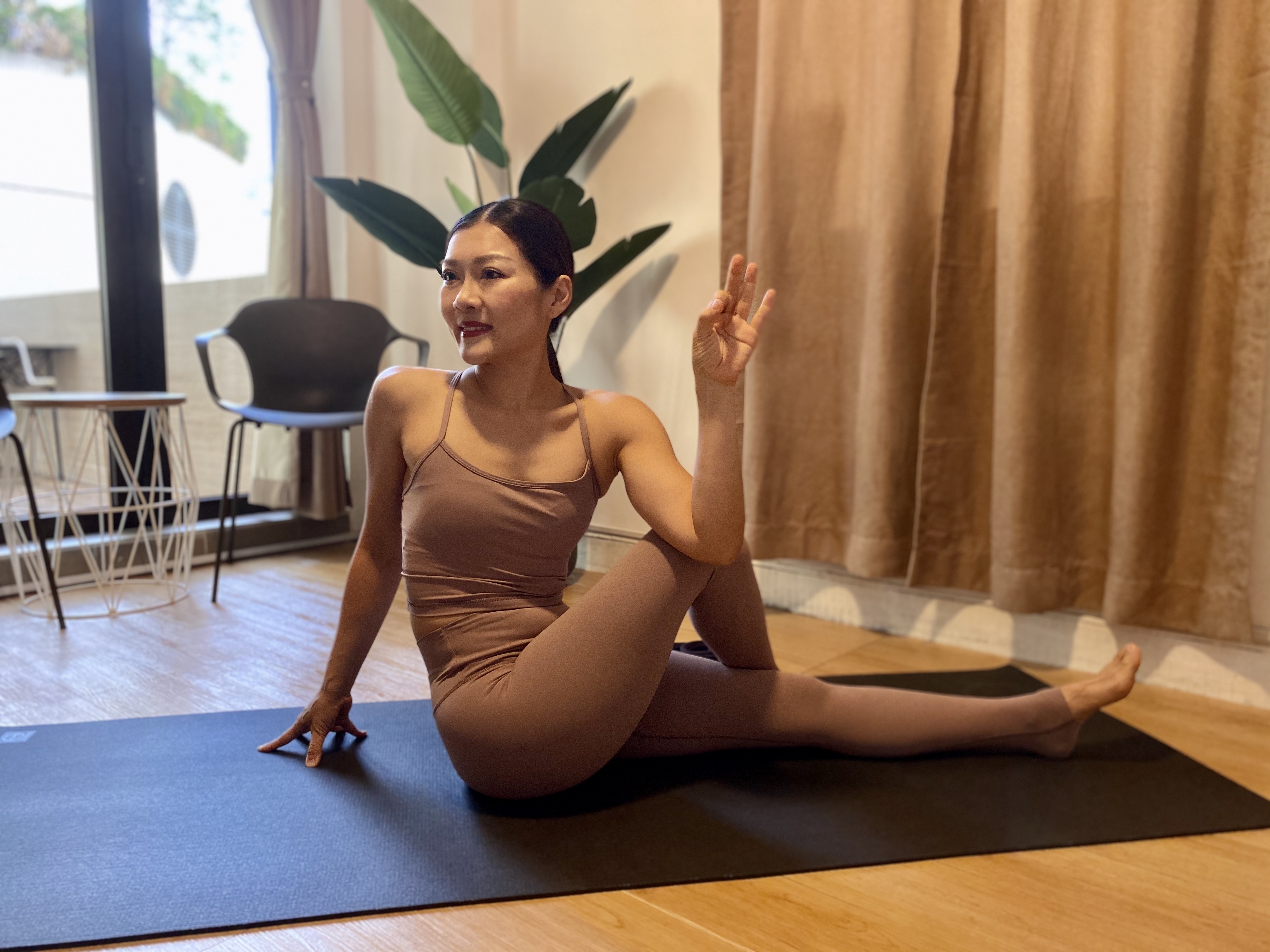 1. 坐在瑜伽墊上,伸直左腳,右邊膝蓋曲起,右腿交疊在左腳外側。